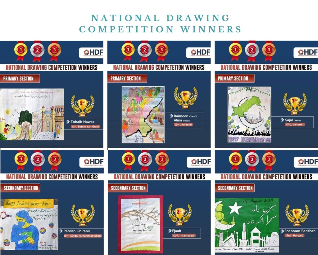 National Drawing Competition Winners On this happy occasion we are NOW announcing the winners of “National Drawing Competition” we launched on 7th August 2020 at HDF formal schools. Everyone who participated deserves a special congrats for their great effort. We are very proud of you..👍 Following are the Winners: Students From Primary Section: Zohaib Nawaz (1st , Rahim Yar Khan) Alina (Class IV, 2nd, Karachi) Sajal (Class V, 3rd, Lahore) Students Secondary Section: Parvish Ghirano (1st , Class IX, Tando Muhammad Khan) Ejaab (2nd, Islamabad) Shabnab Badshah (3rd, Class IX,Mardan) Keep up your spirits high and always aim high. Sometimes we win sometimes we don’t. But this fine because we keep moving forward and trying our best. Stay safe 👍 #PakistanDay #celebrations #hdf #winners #children #education #competition #PakistanZindabad